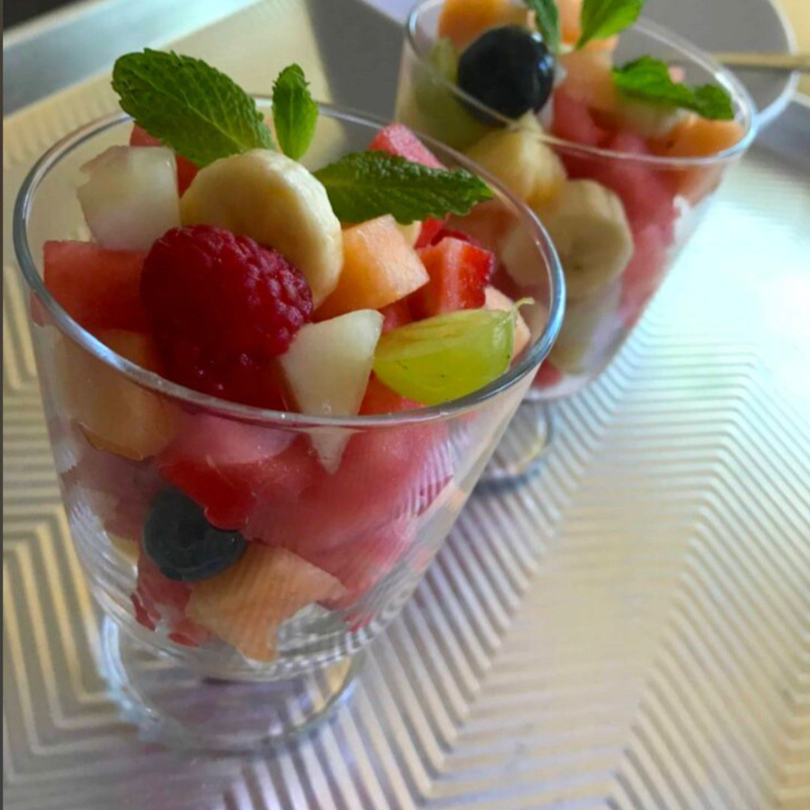 Melón, piña, sandía, papaya, fresa, yogurt griego y granola.