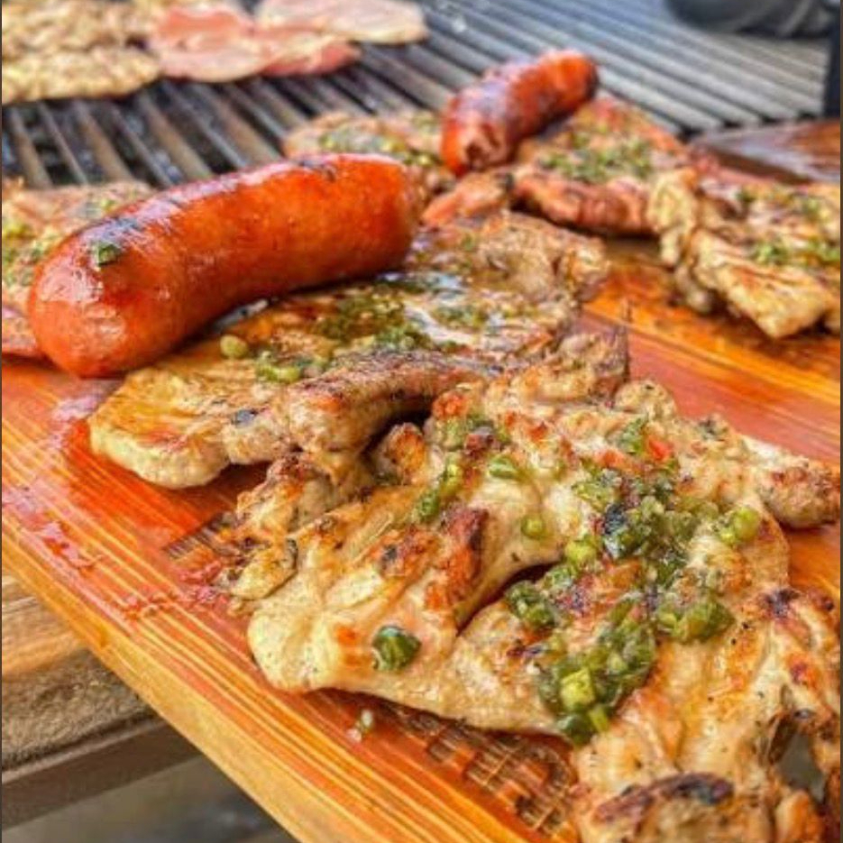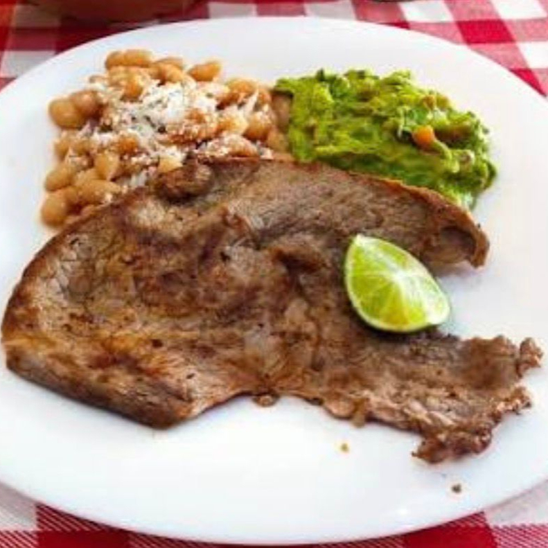 Bistec, chorizo, pollo, guacamole, nopal asado, frijoles y tortilla.