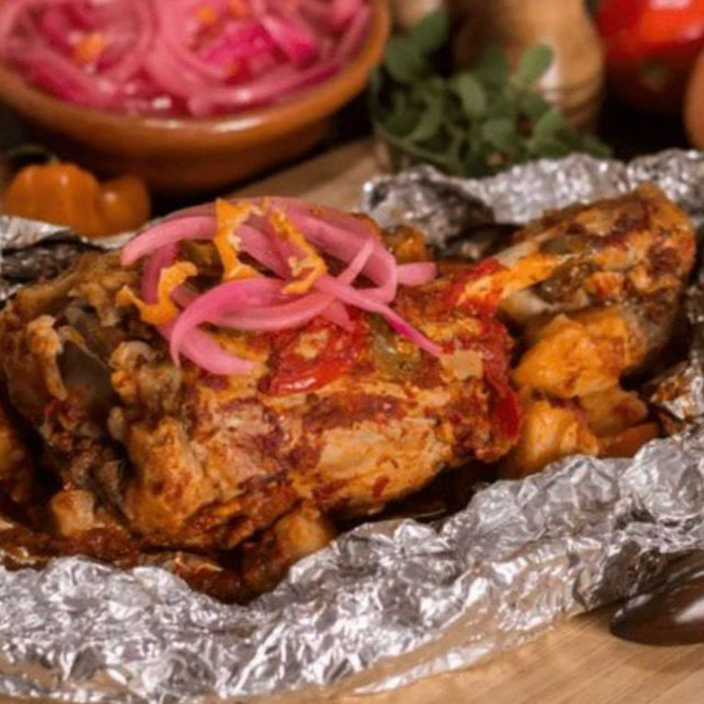 Chamorro al adobo (para 2 personas), con ensalada de nopal al limón y salsa.