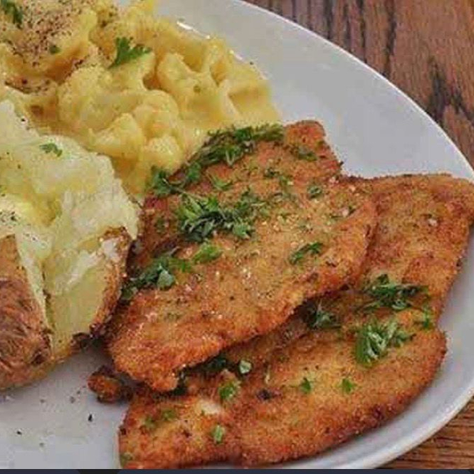 Milanesa, pasta fría, puré de papa, pan, ensalada y salsa.
