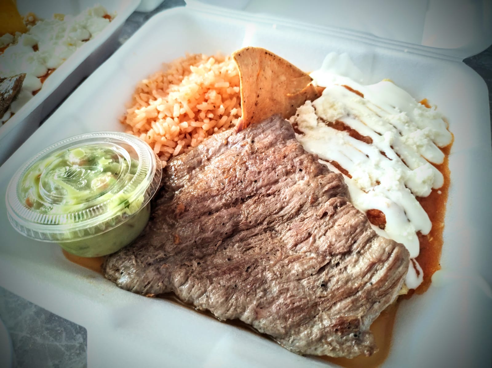 150 Gramos de deliciosa arrachera (antes de cocción), acompañada de arroz, frijoles y deliciosas enchiladas con salsa roja y verde.