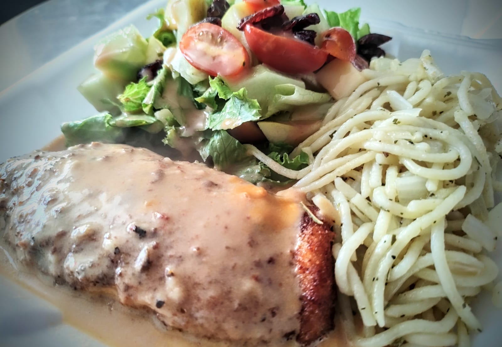 Deliciosa pechuga asada, acompañada de arroz o espaguetti y ensalada de la casa.