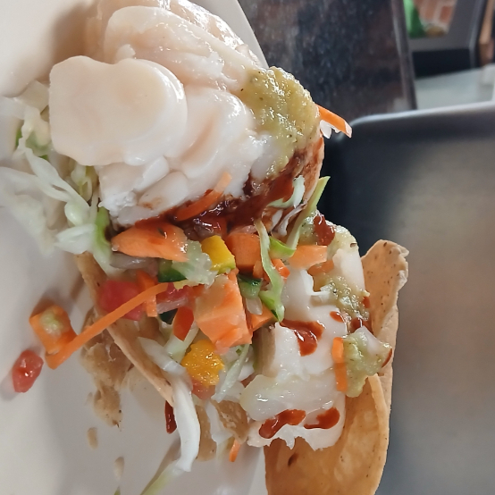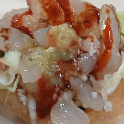 Tosta de camarón, con una cama de ceviche de pescado y una buena porcion de camarones los camarones son completos no es ceviche