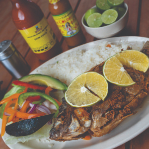 Mojarra Frita medina, acompañadad e ensalada dulce, arroz y ensalada verde.