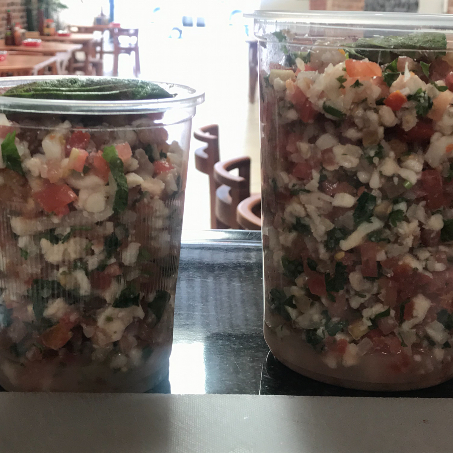 1 litro de ceviche de pescado en trozos, acopañado de jitomate, cebolla, cilantro y aguacate