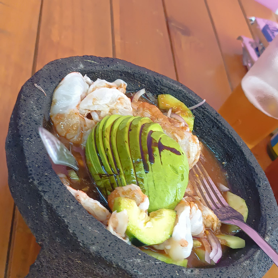 Buena porcion de camarón, pulpo, ostion y salsa especial de casa con aguacate.