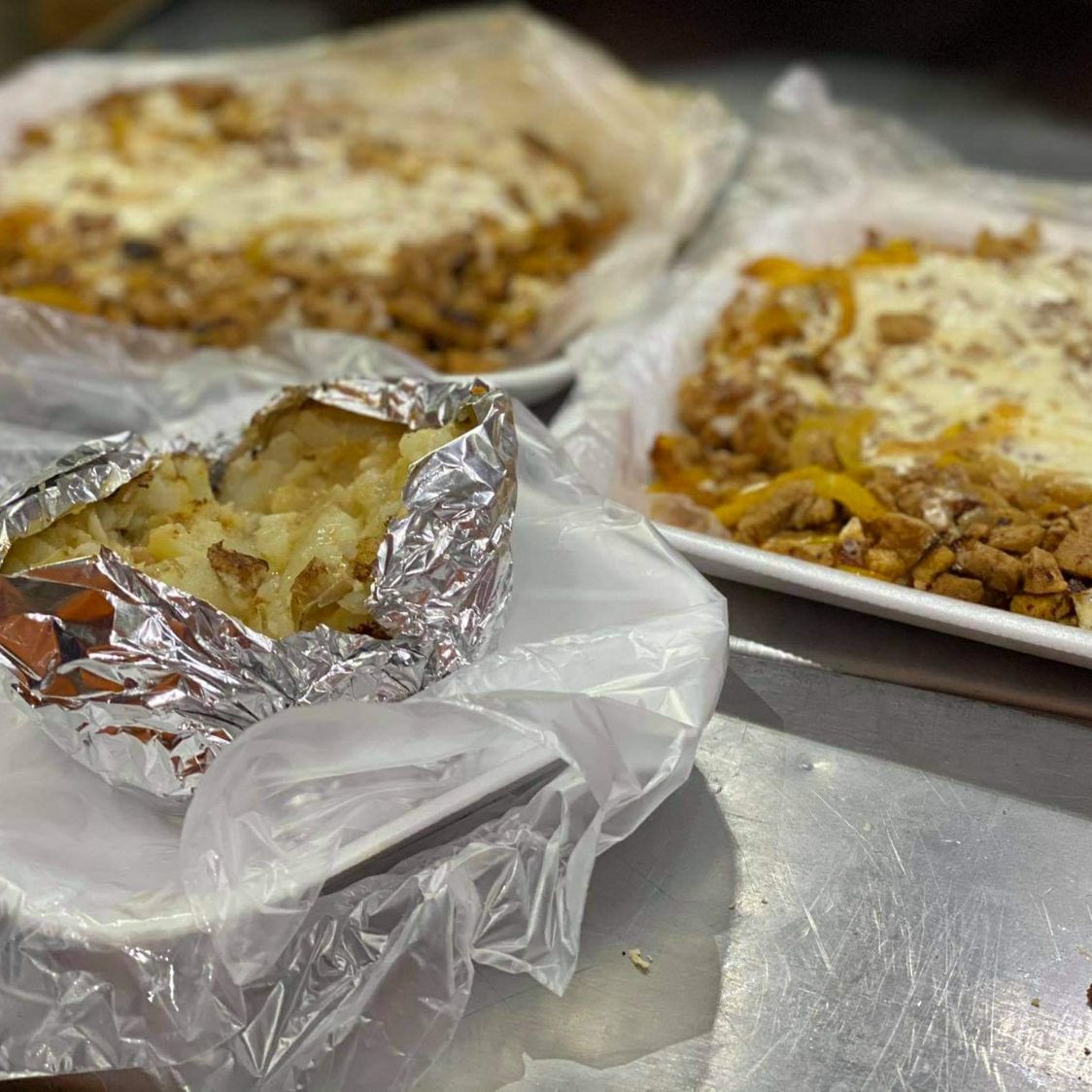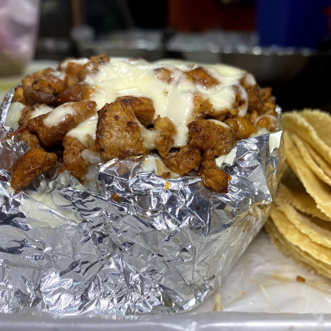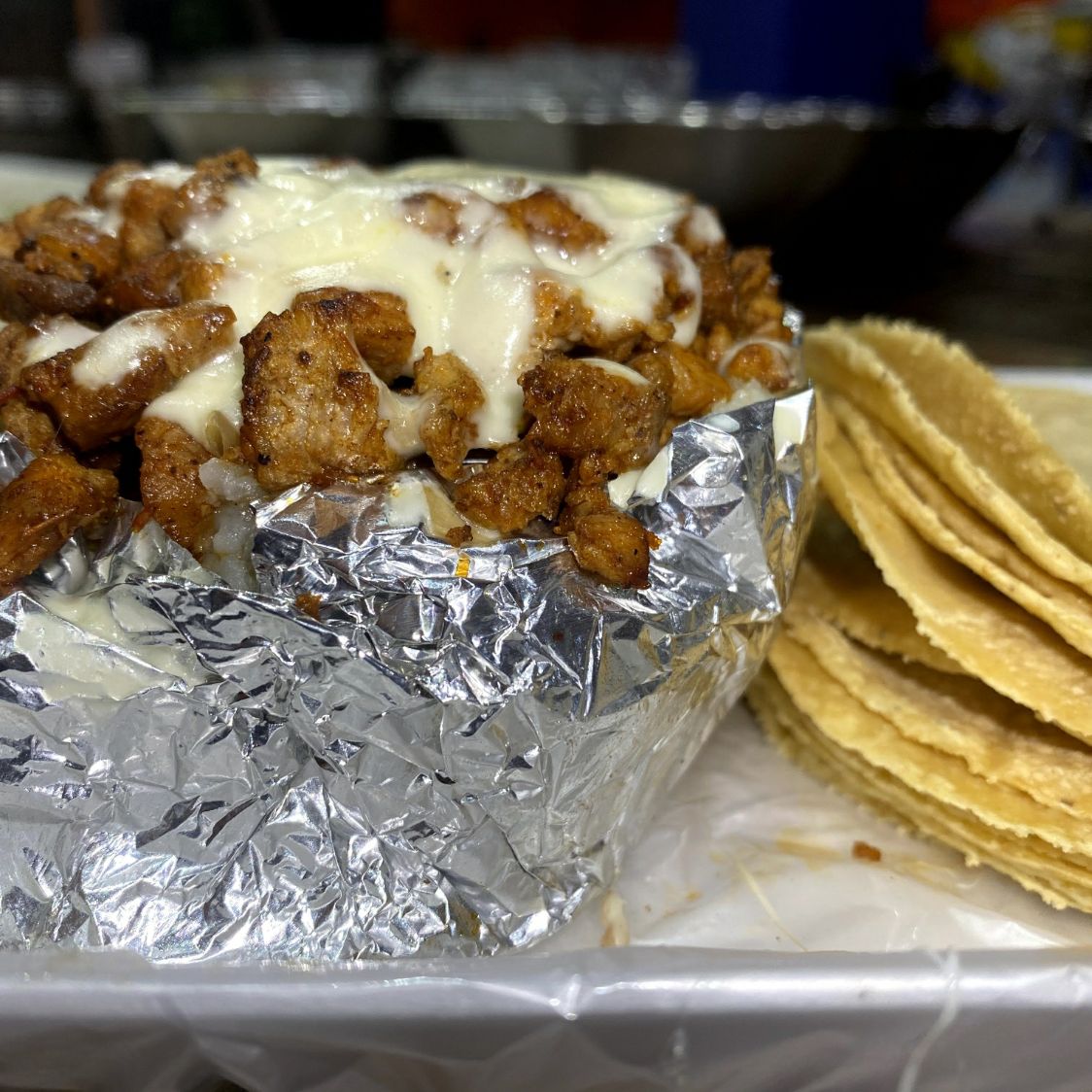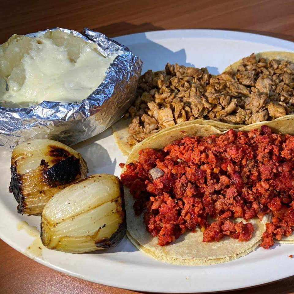 4 tacos, Bisteck y Chorizo, Papa mantequilla.