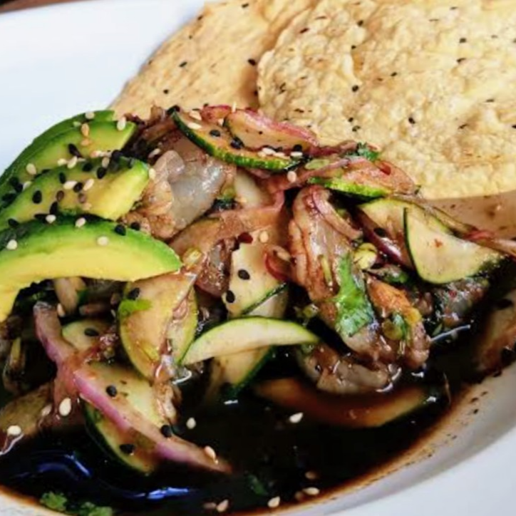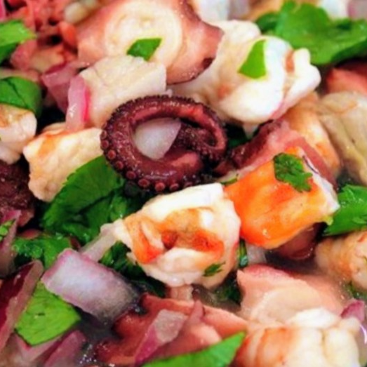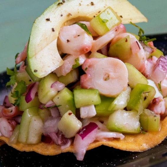 Tostada de Ceviche Mixto Camarón y Pulpo
