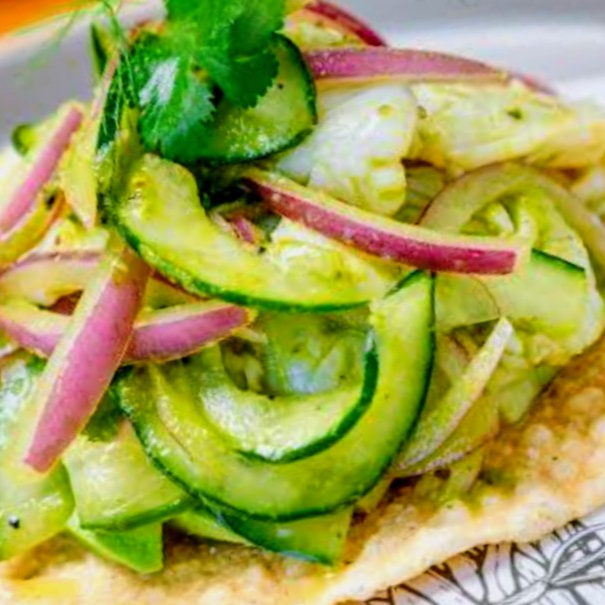 El sabor del aguachile verde servido sobre una tostada de maíz artesanal muy crujiente.