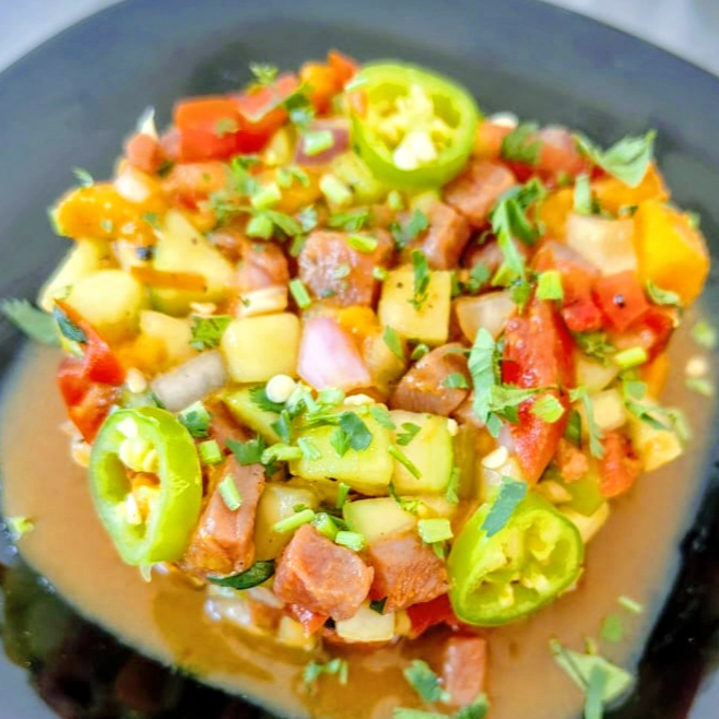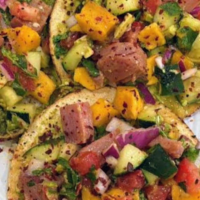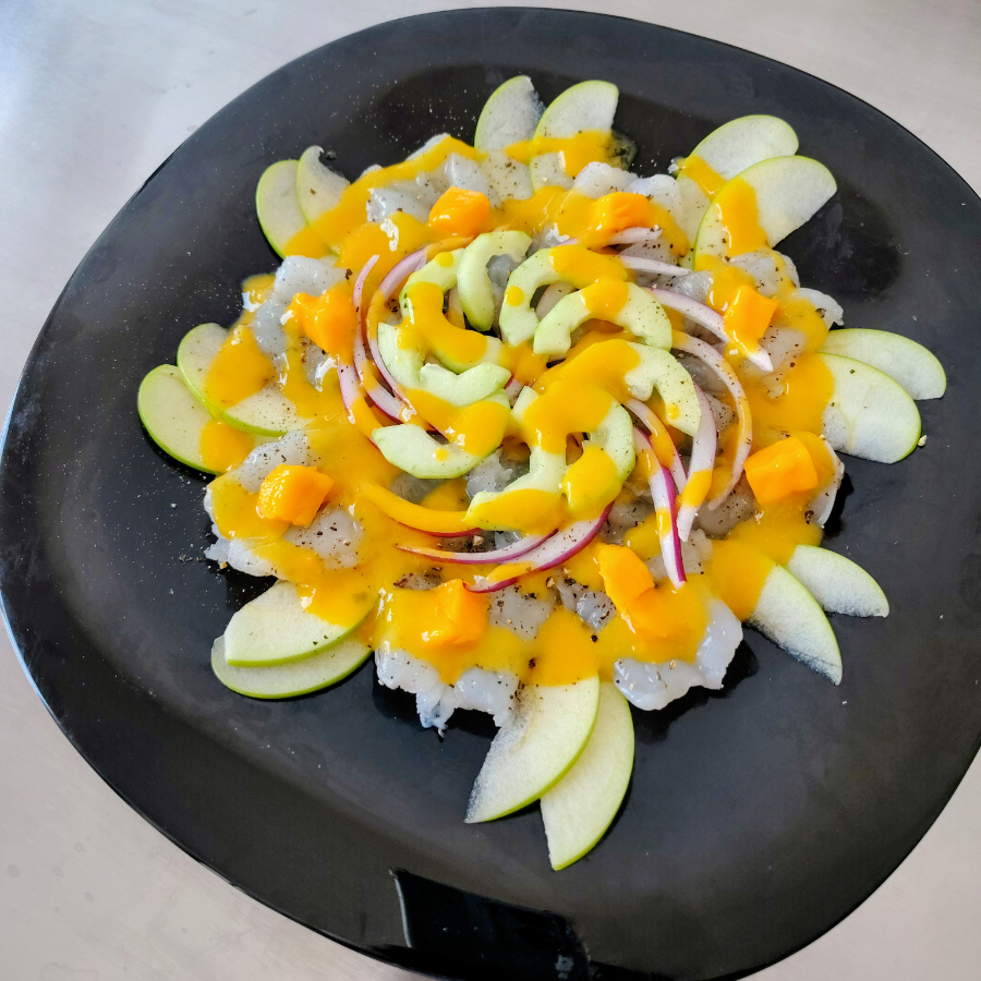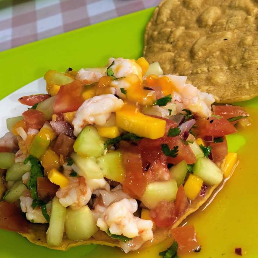 Tostada crujiente coronada con ceviche tropical, una explosión de sabor dulce y salado.