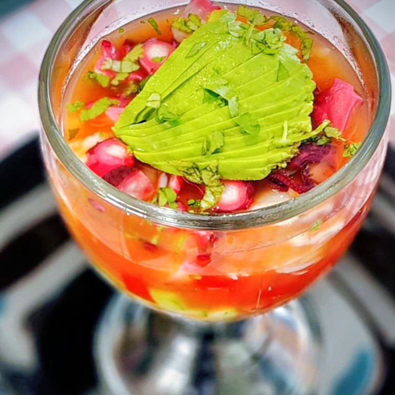 Gran combinación de mariscos servida en nuestra icónica copa Chabela con salsa coctelera artesanal.