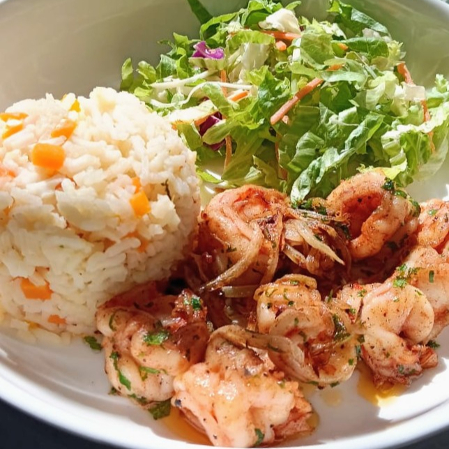 Camarones grandes salteados en mantequilla, ajo seleccionado y un toque de chile.