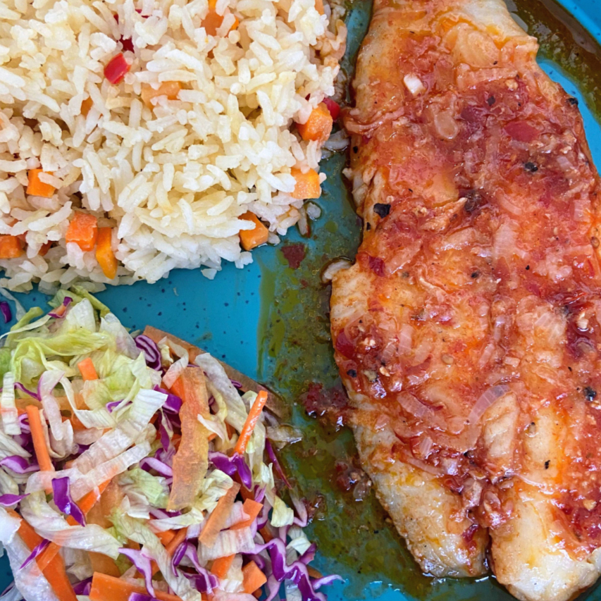 Filete de pescado fresco salteado con láminas de ajo dorado y chiles secos.