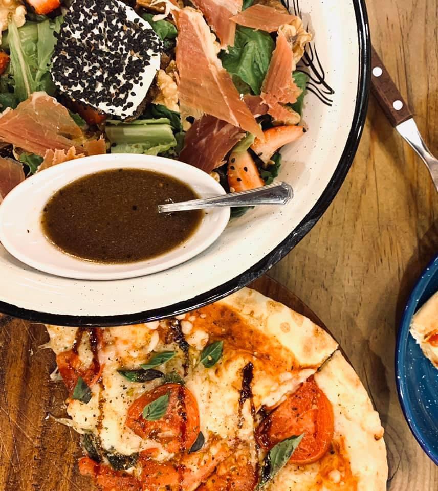 Mix de lechugas, higos deshidratados, fresa, ajonjoli, queso de cabra, jamón serrano y aderezo de mostaza con miel.