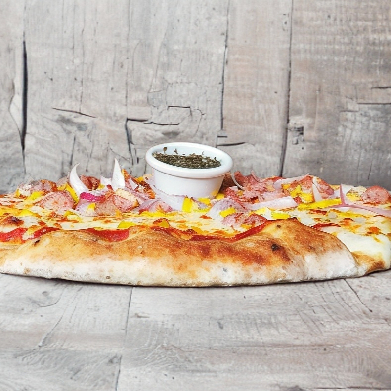 Arrachera, tocino, pastor, chistorra, queso provolone, jalapeños, cebolla y champiñone.