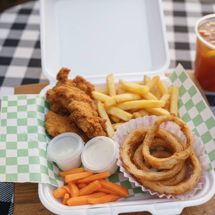 190 gramos de tiras de pollo crujiente, 115 gramos de papas a la francesa 5 aros de ceboola, acompañado de aderezos, un platillo crujiente para deleitar