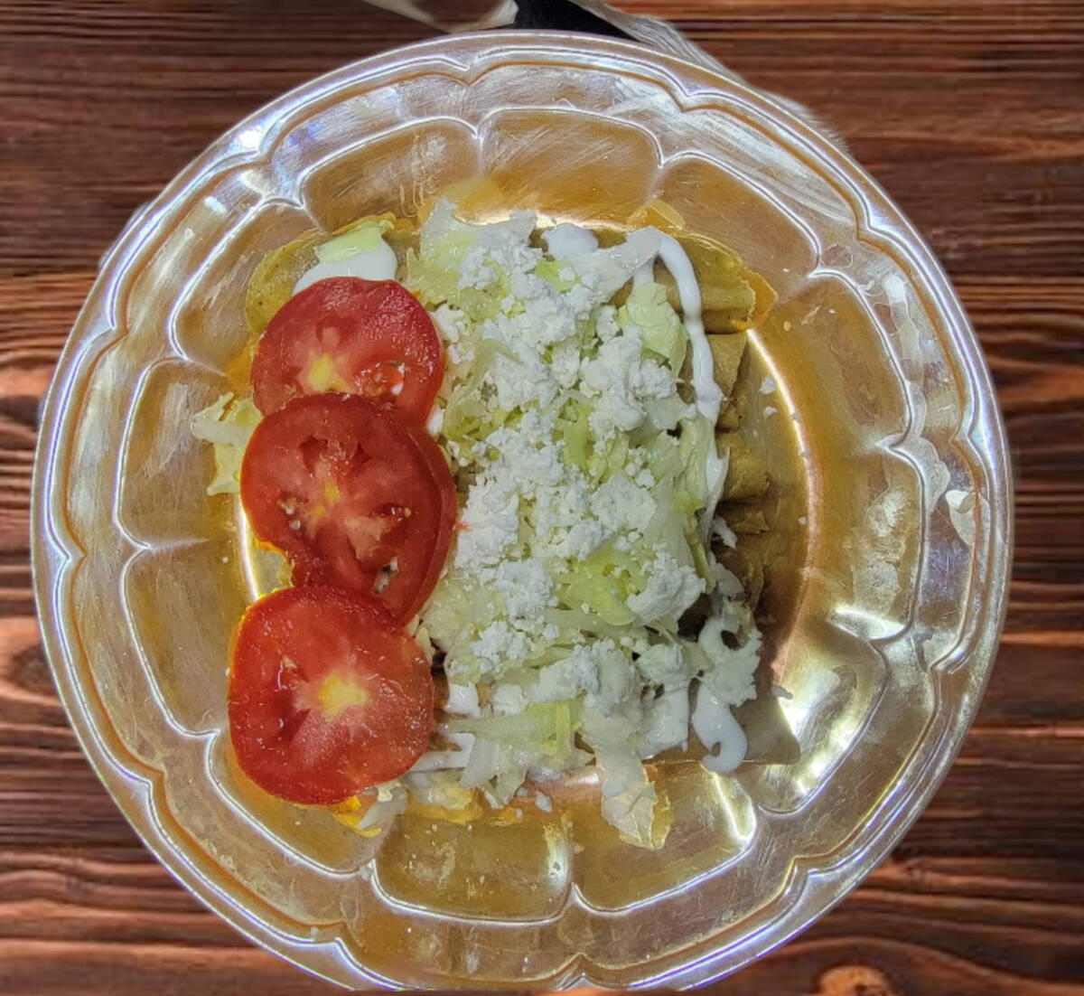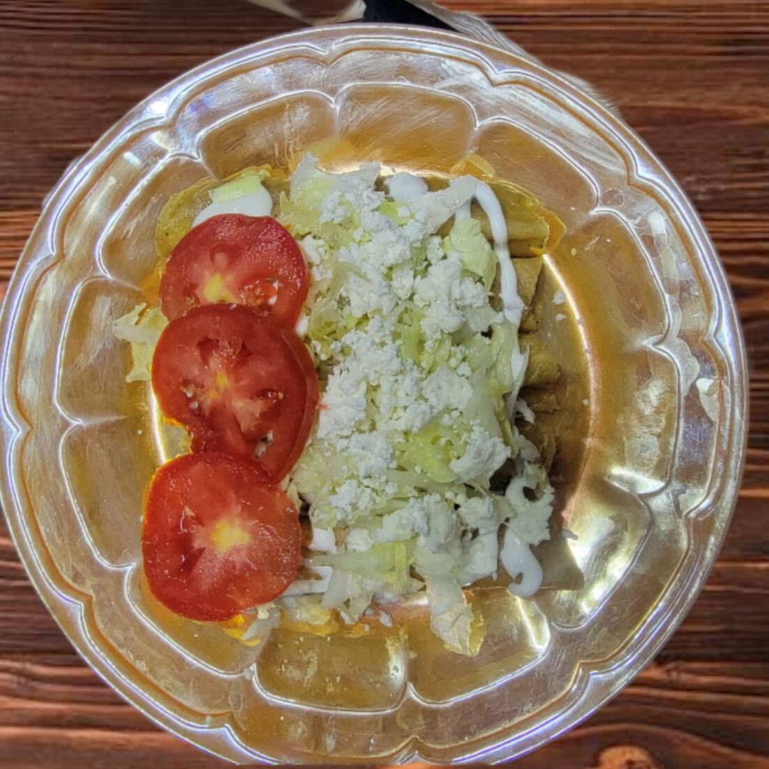 Crujientes tacos dorados de pollo, bañados generosamente en nuestra vibrante salsa verde, con una cama de lechuga, queso fresco y crema ¡Una explosión de sabor! 5 pz