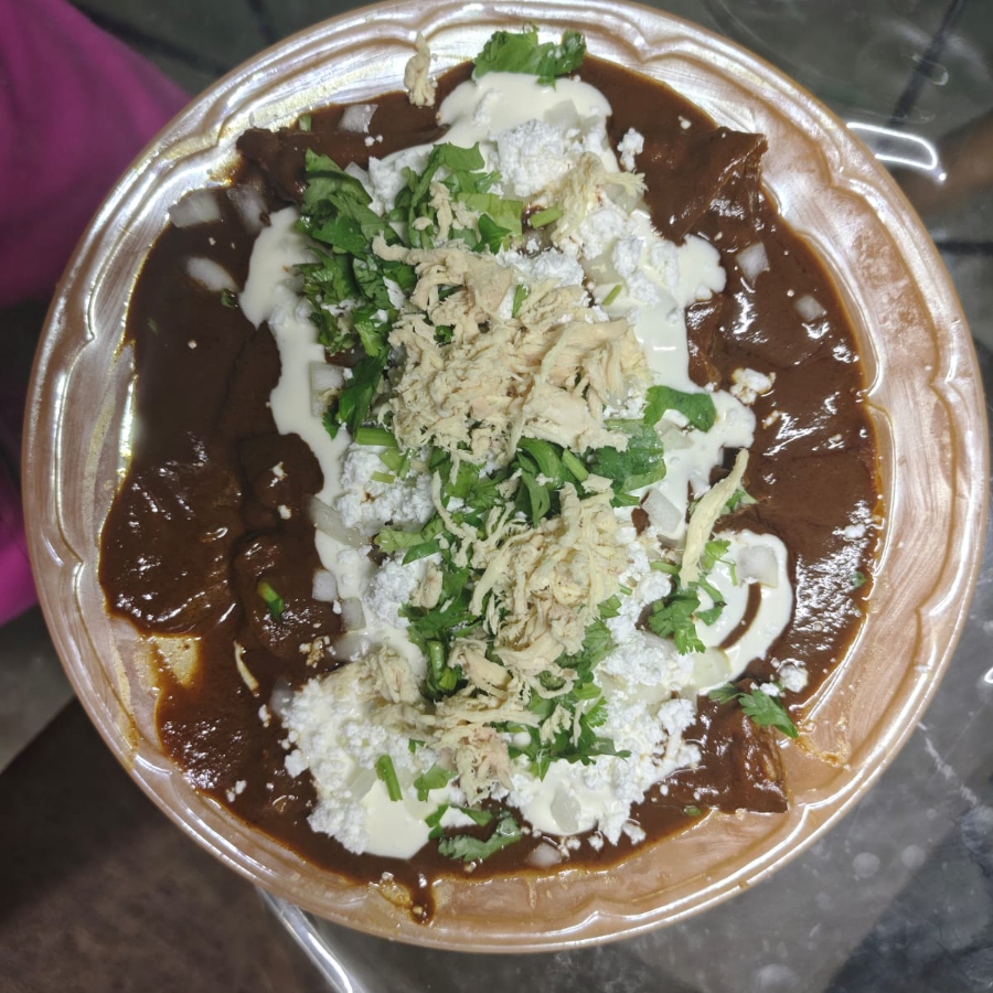 5 tortillas bañadas de rico mole acompañadas de queso, crema, cebolla queso y pollo