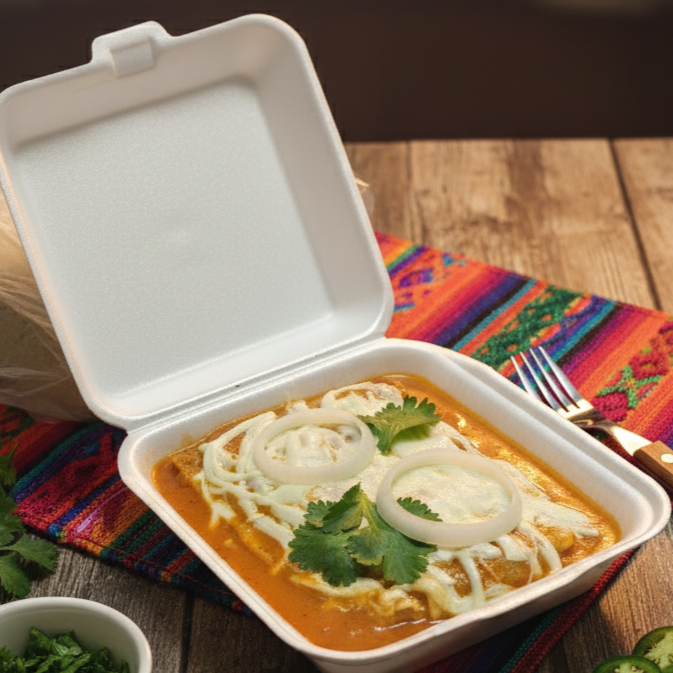 6 tortillas rellenas de pollo, mitad de chile verde y mitad chile rojo, gratinadas con queso asadero aros de cebolla y un toque de cilantro.
