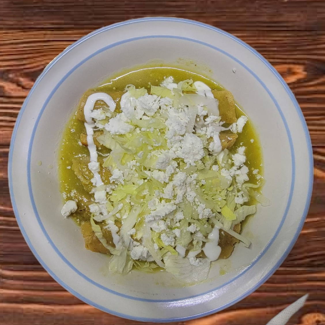 Cinco tortillas bañadas en nuestra salsa verde casera, rellenas de pollo deshebrado y cubiertas con crema, queso fresco, cilantro y cebolla.