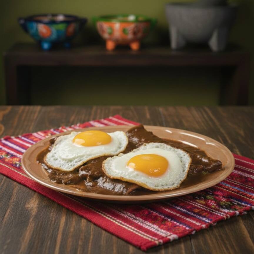 4 tortillas bañadas en mole, con 2 huevos estrellados y pollo.
