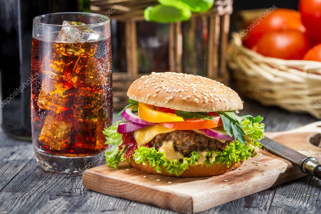 Hamburguesa con Carne de res (150 gr) con queso americano, tocino, cebolla caramelizada, jitomate y pepinillos.