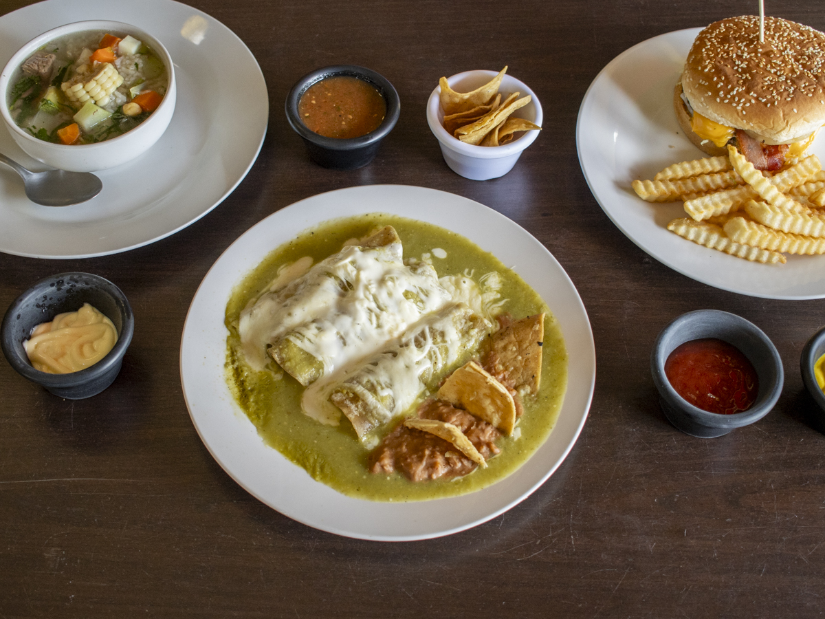 Sopa azteca o caldo tlalpeño o espageti arrachera o enchiladas verdes o milanesa agua de sabor