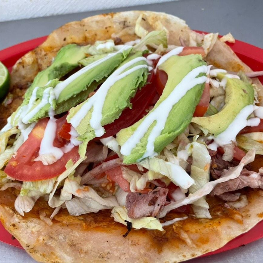 Arrachera marinada de primera calidad con queso asadero fundido, aguacate, lechuga, jitomate, cebolla y crema.