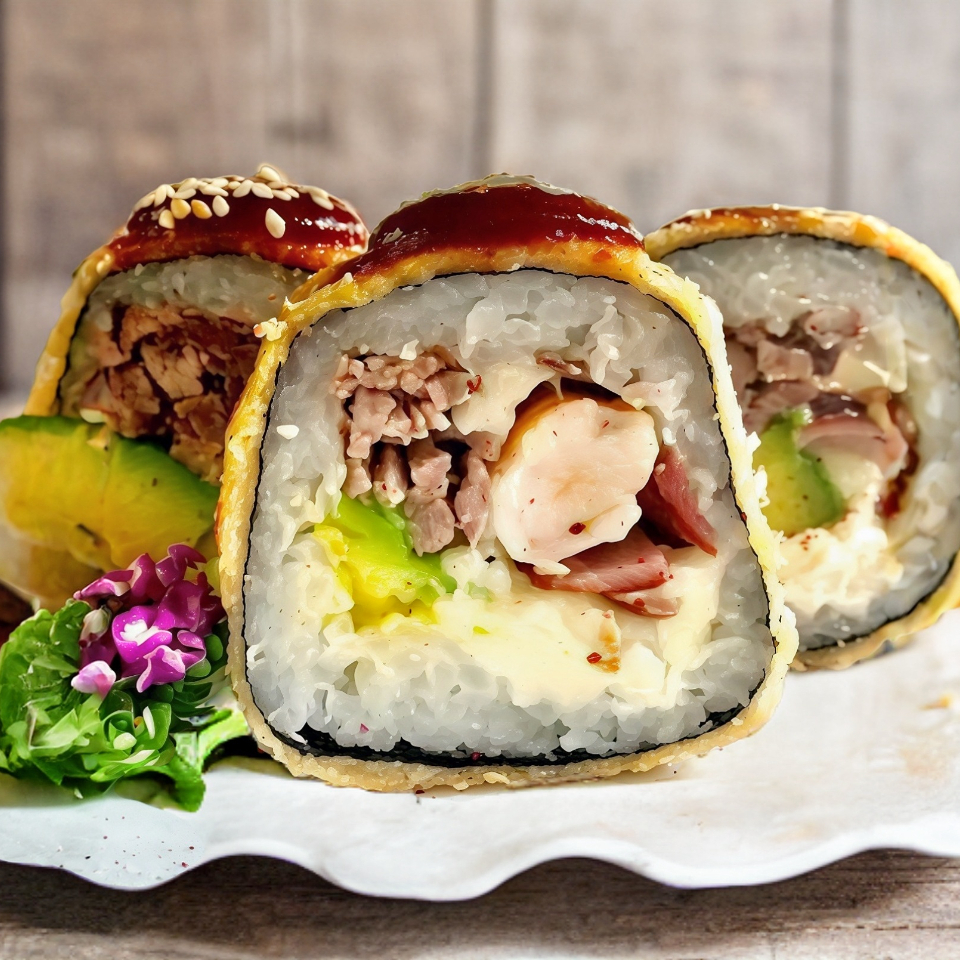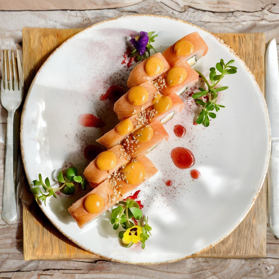 Dentro: aguacate y queso Fuera: mozzarella y salmón coronado con camaron cebolla caramelizada y chipotle.
