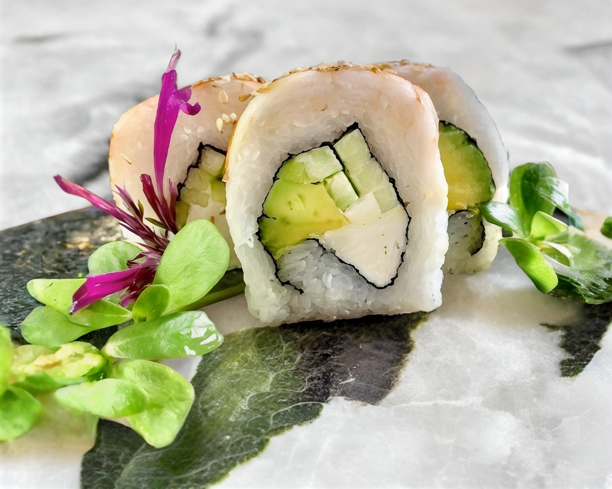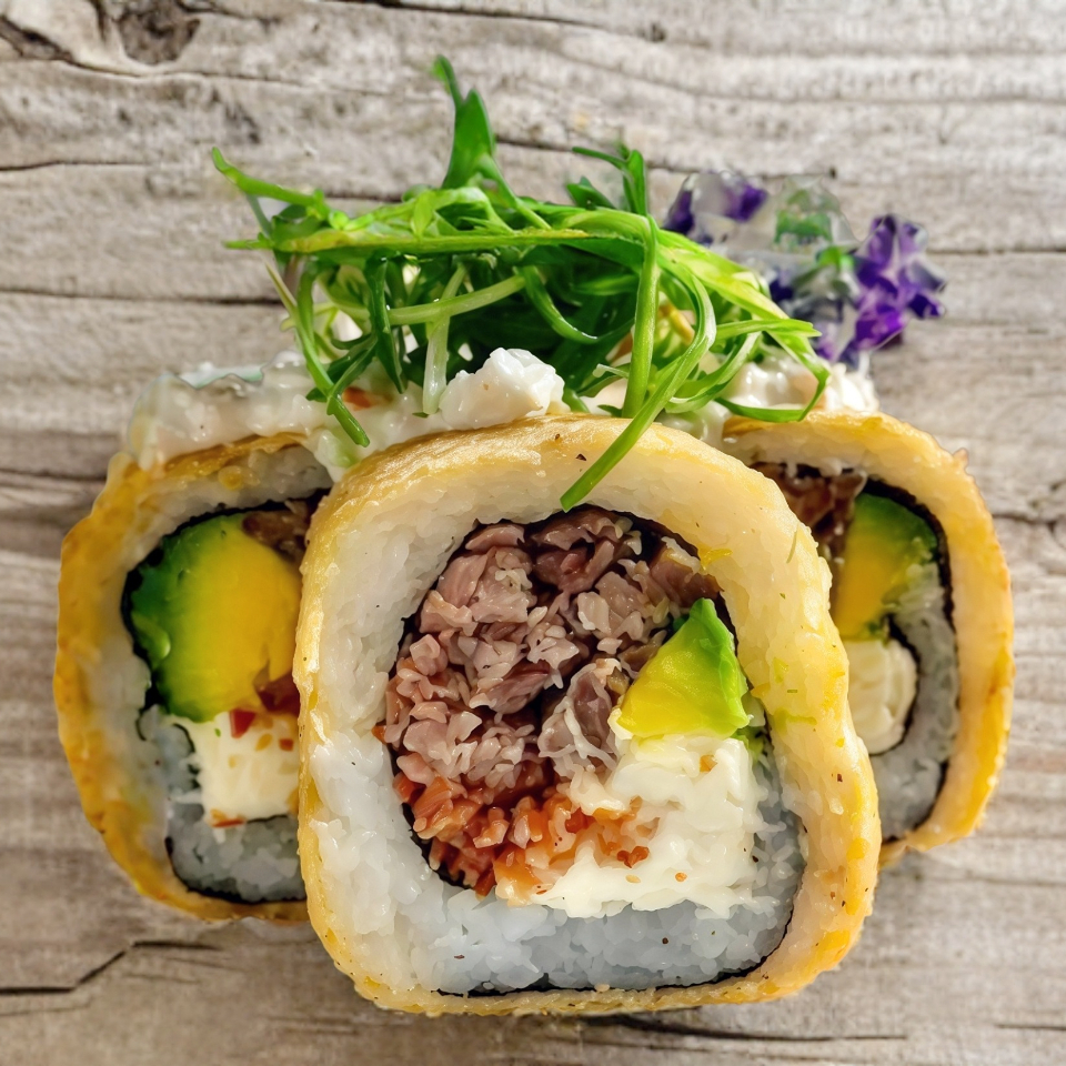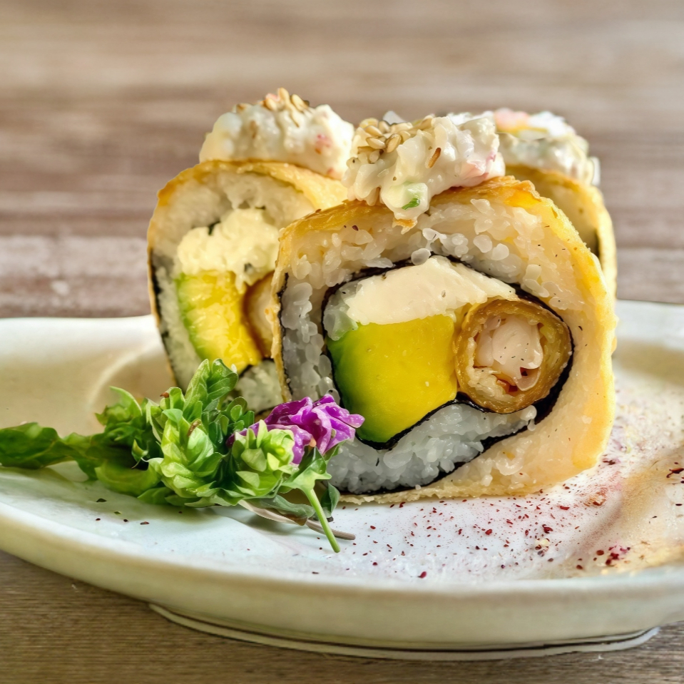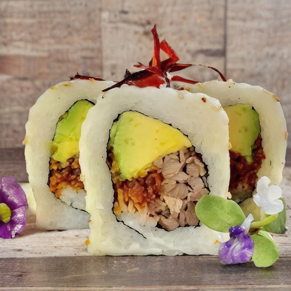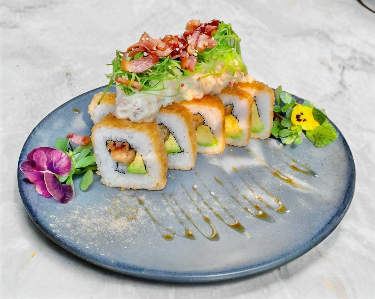 Dentro: camarón y aguacate Fuera: mix atún, jalapeño y quesos.
