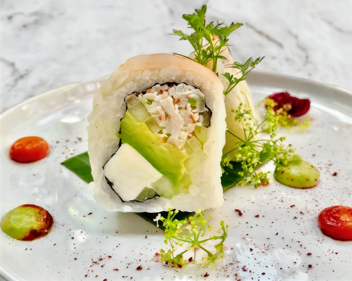 Por dentro: cangrejo, queso y aguacate. Por fuera: kakiague y salsa unagui.