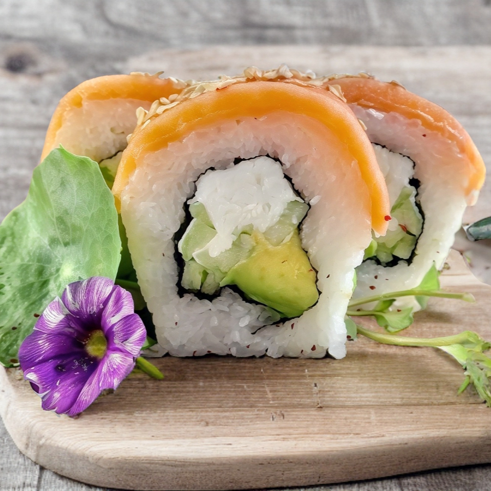 Dentro: Queso, pepino y aguacate Fuera: salmón.