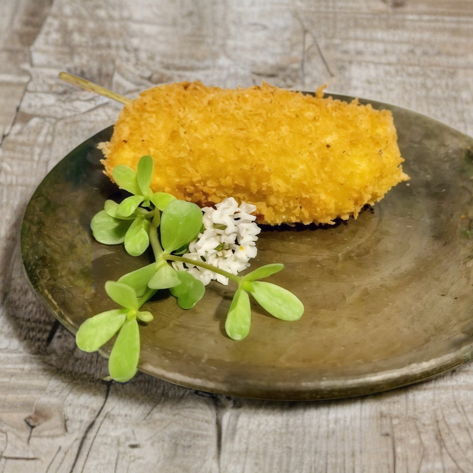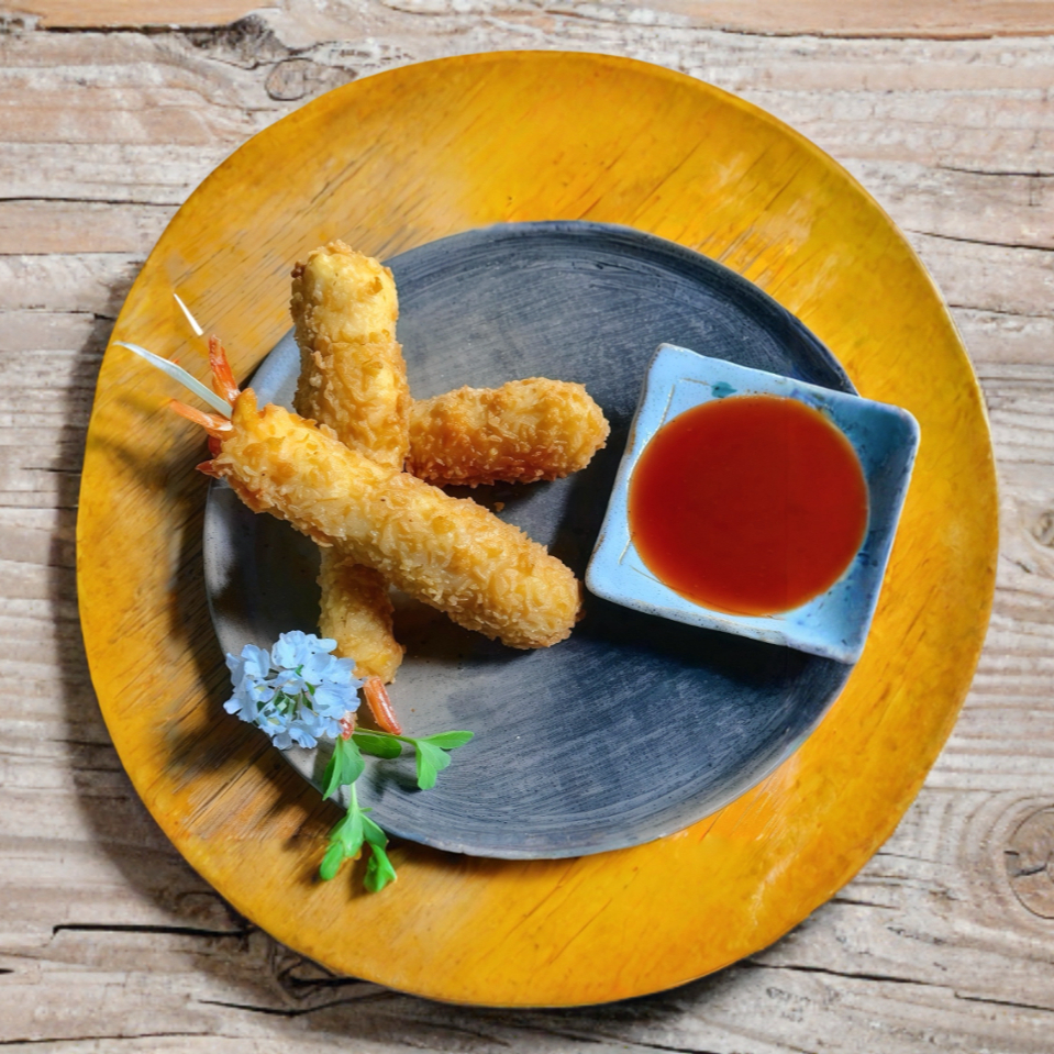 Dentro: camaron queso aguacate Fuera: platano frito con salsa chipotle.