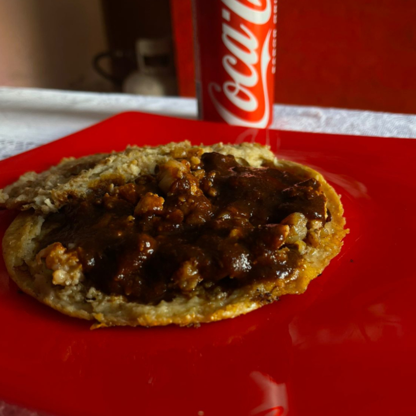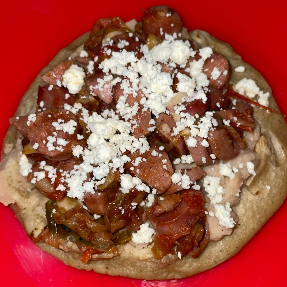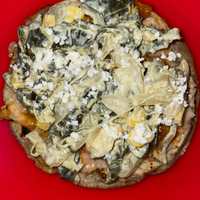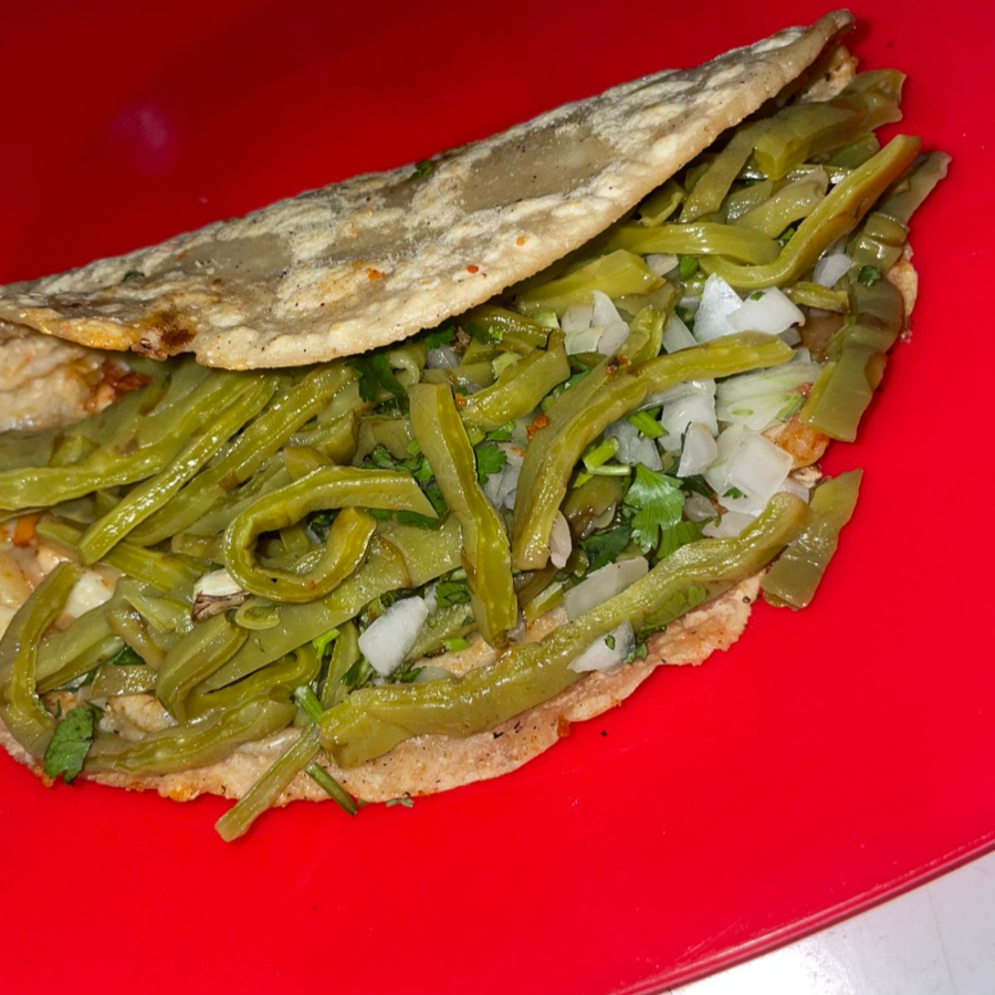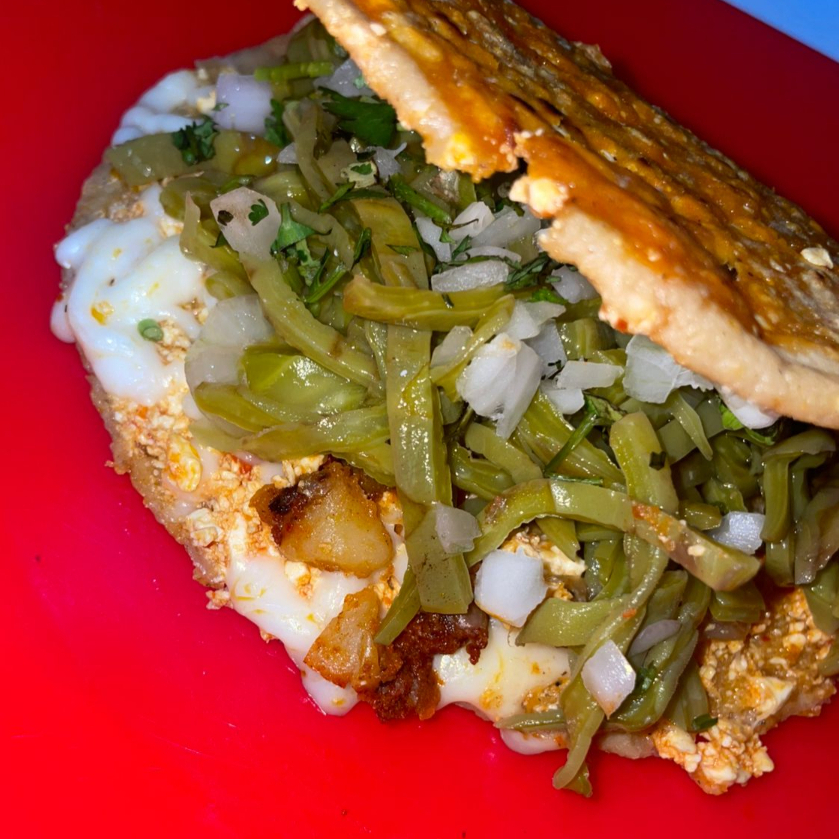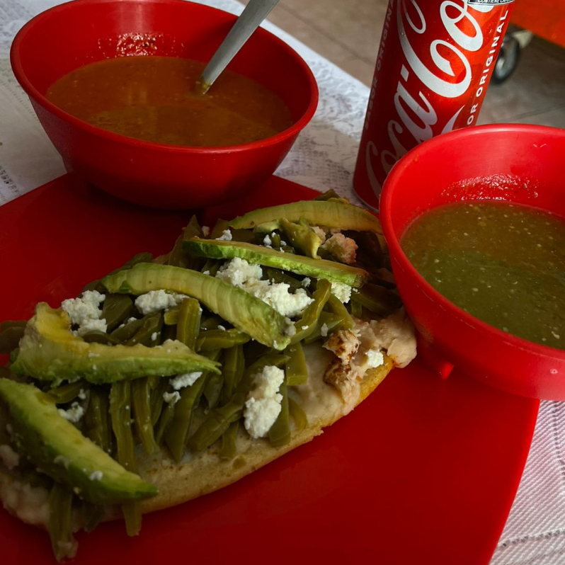 Tlacoyo artesanal de maíz al comal con capa de frijoles, queso asadero derretido, queso ranchero, aguacate, nopales y salsa roja o verde.