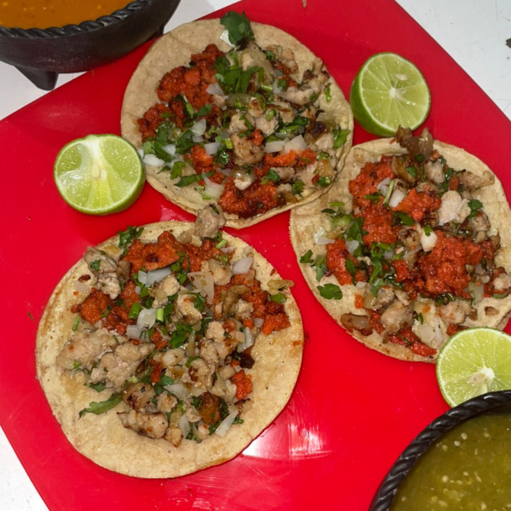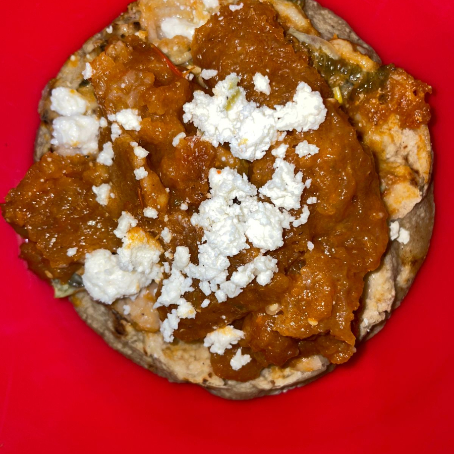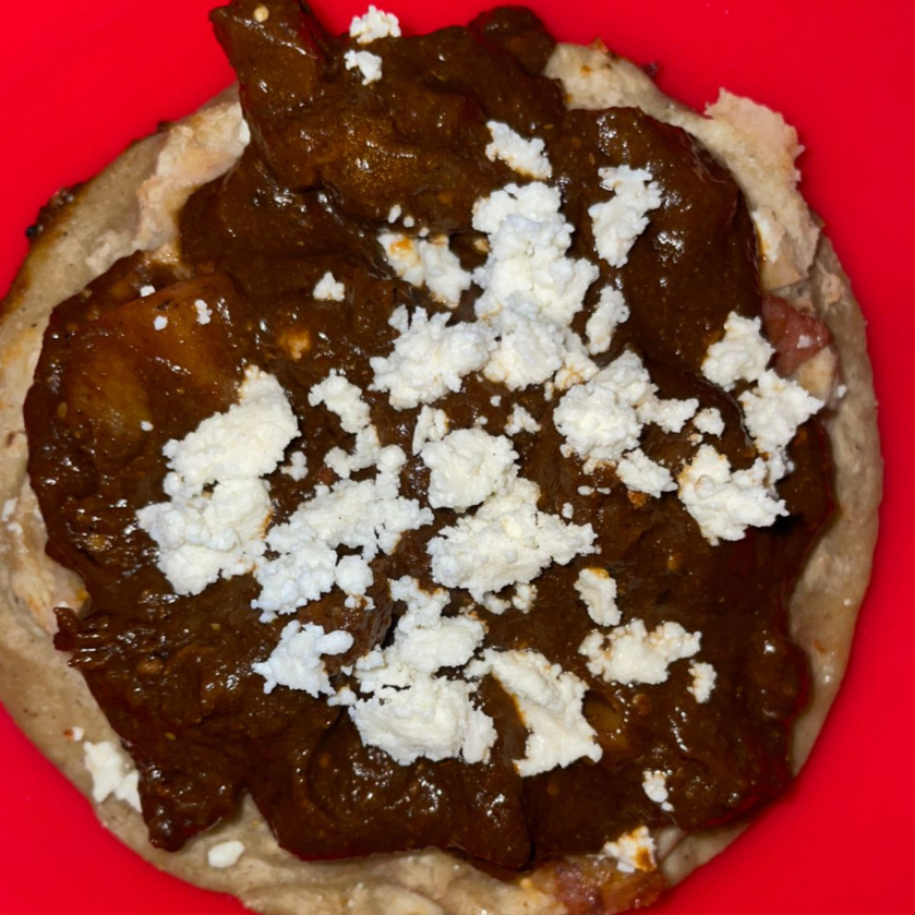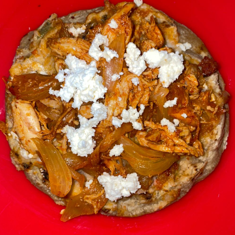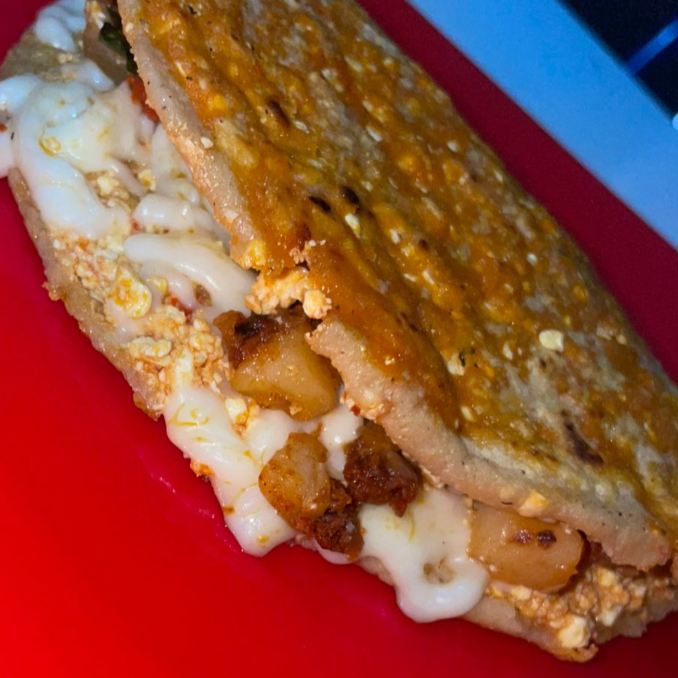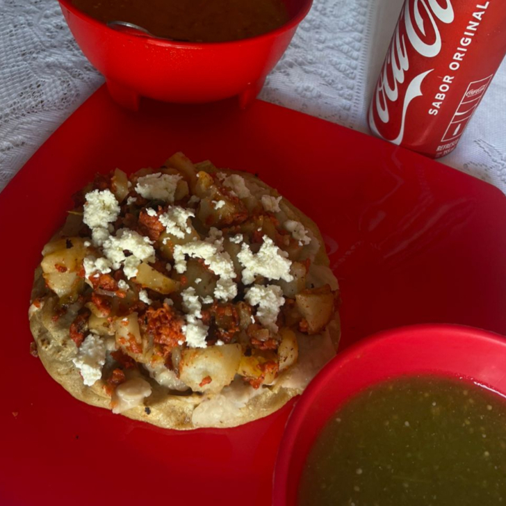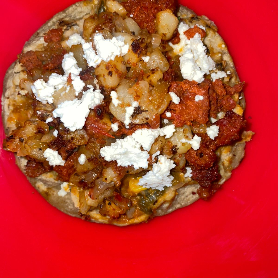 Tlacoyo artesanal de maíz al comal con capa de frijoles, queso asadero derretido, queso ranchero, aguacate, nopales y salsa roja o verde.