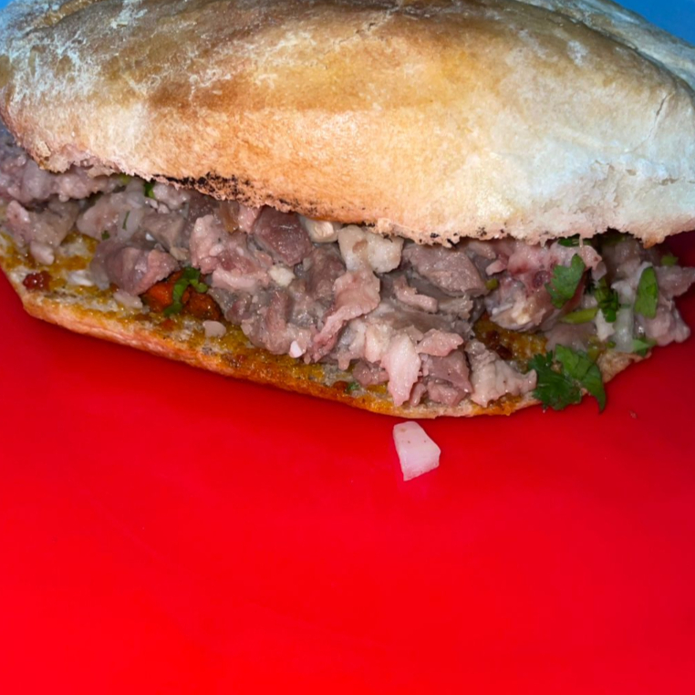 Torta de cabeza de puerco con su verdura, cebolla y cilantro