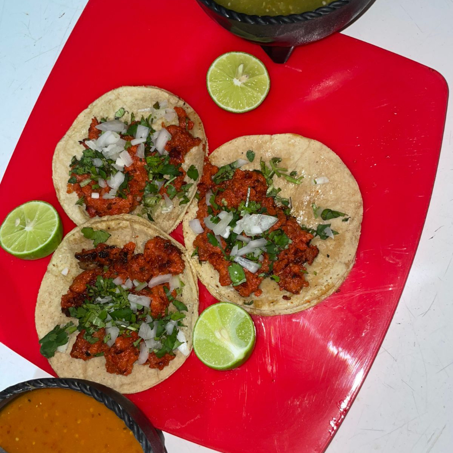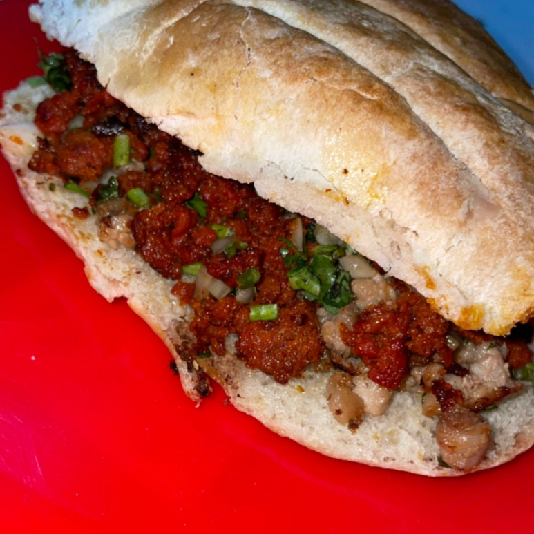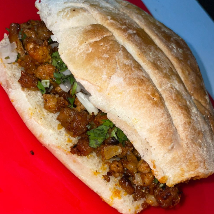 Torta con carne adoba al pastor con verdura, cebolla y cilantro