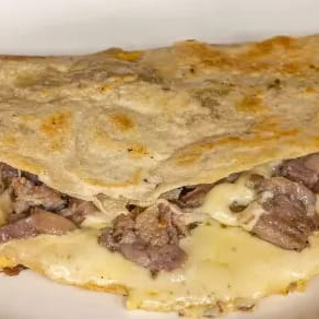 Tortilla grande tipo burrera rellena de queso fundido y arrachera, con salsa verde o roja, guacamole, cebolla y cilantro.