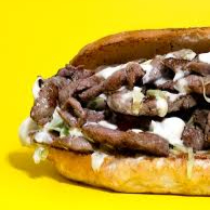 Bolillo normal calientito relleno de arrachera, con salsa verde o roja, guacamole, cebolla y cilantro.