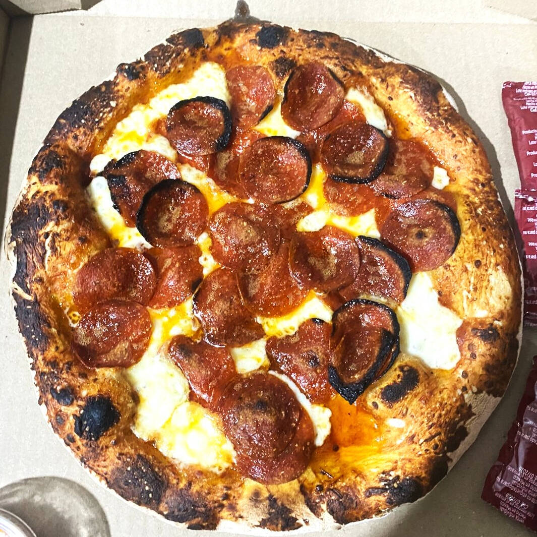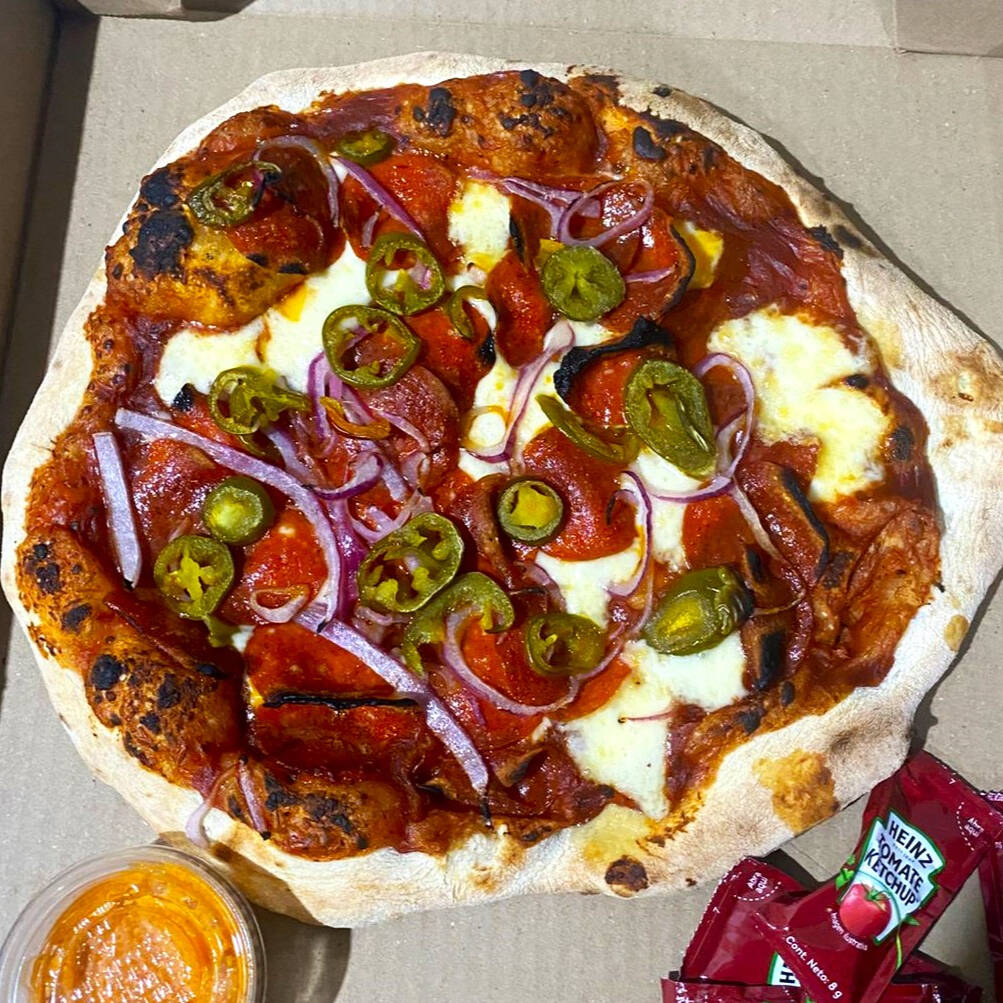 Masa tradicional, salsa de tomate, mezcla de quesos, pepperoni, cebolla morada y jalapeño