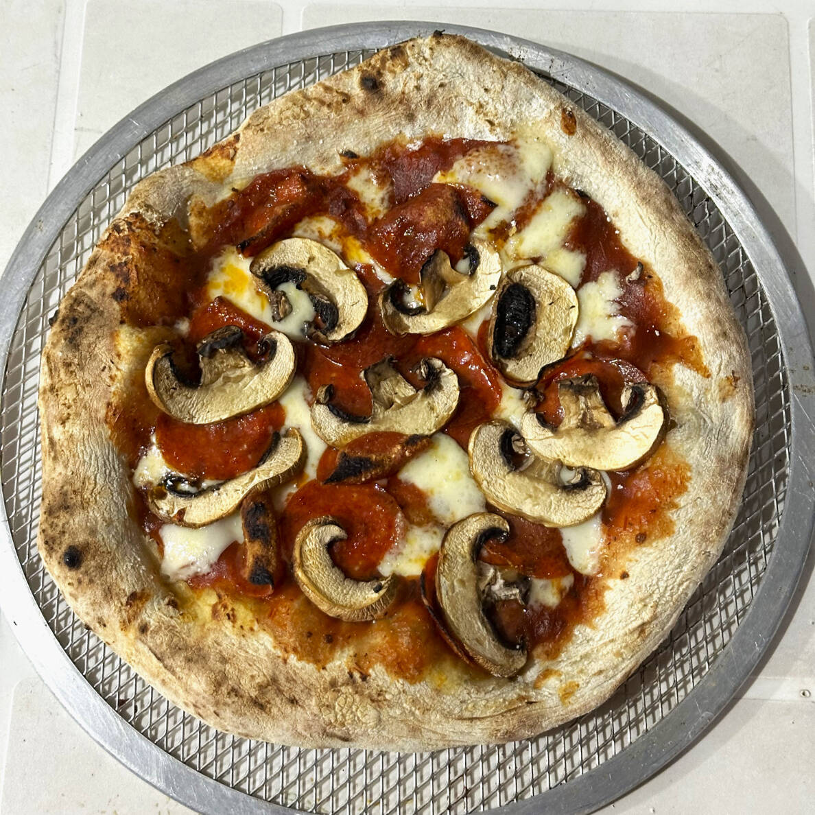 Masa tradicional de la casa, salsa de tomate, mezcla de quesos, pepperoni y champiñones