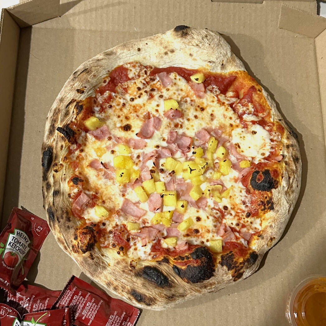 Masa tradicional, salsa de tomate, mezcla de quesos y piña