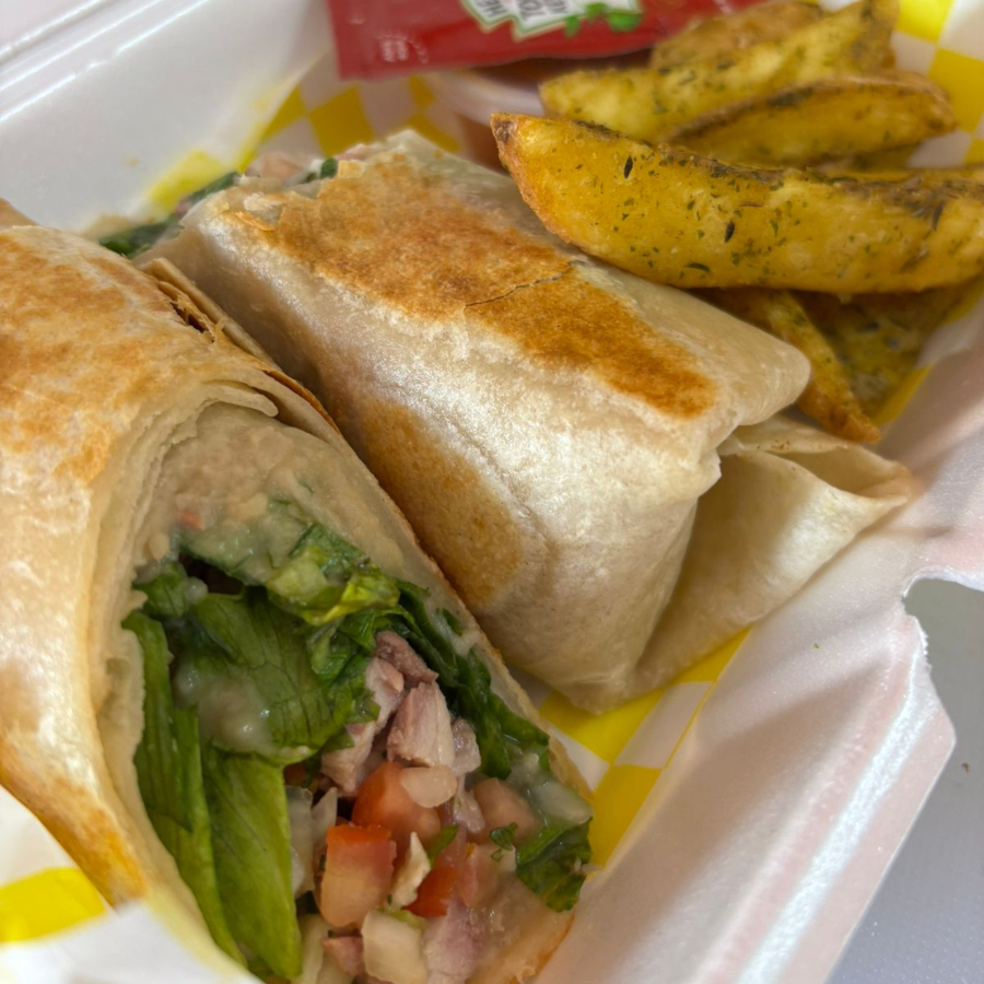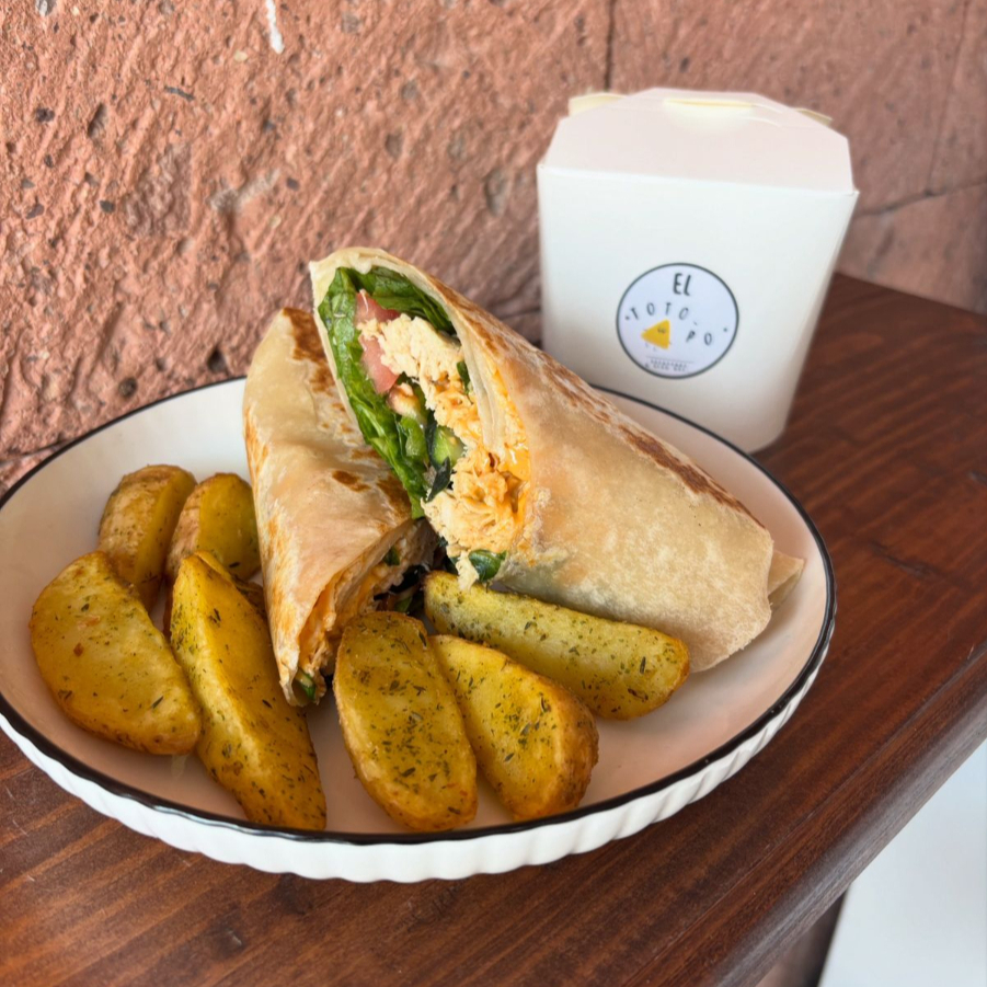 Wrap de arrachera, frijol, mix de lechuga y pico de gallo. Acompañado de salsa ranchera. Incluye papa gajo.
