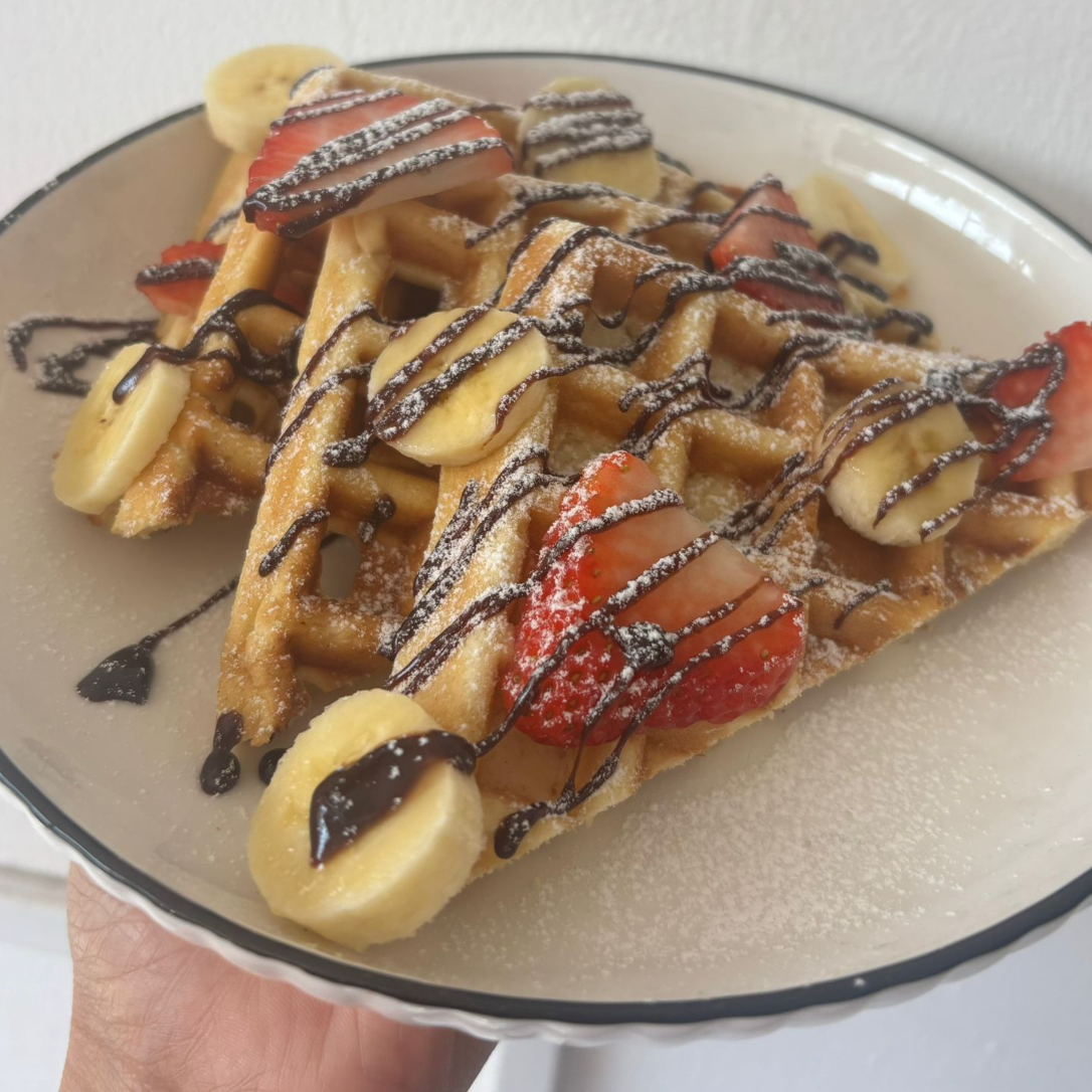 4 Pzas de waffle, acompañado de plàtano y fresa. A elegir: Chocolate, lechera, dulce de leche
