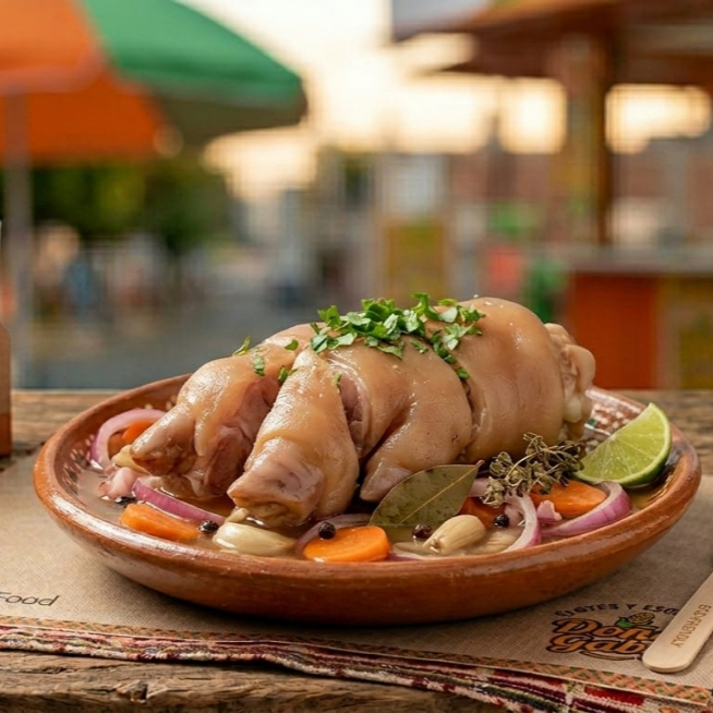 PATA DE PUERCO COCIDA, VINAGRE, SAL, LIMON Y SALSA