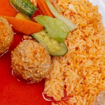 Albondigas acompañada de, arroz, ensalada, tortilas y salsa