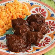 Carne de Puerco con Chile Negro acompañada de arroz, ensalada, tortilas y salsa
