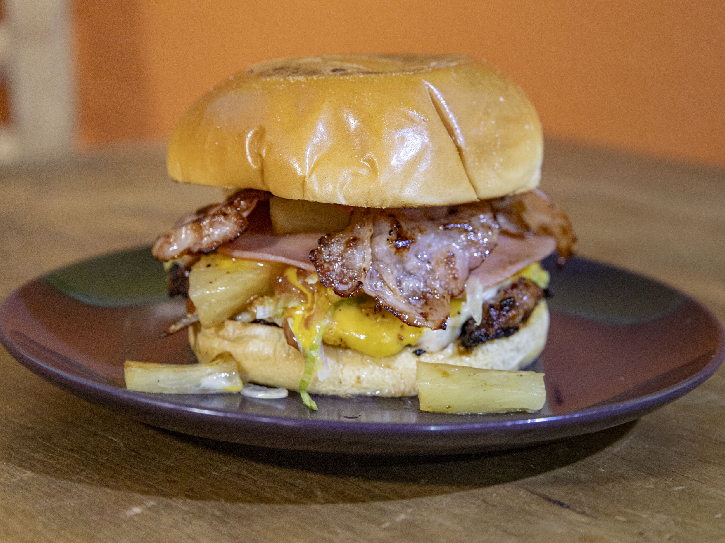 pan de matequilla ,carne artesanal ,tocino , piña ,queso asadero ,queso amarillo ,verdura y aderezos