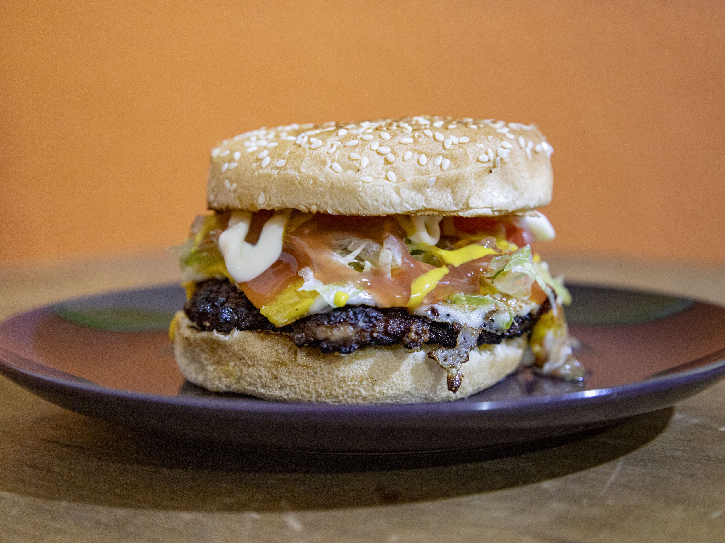 pan con ajonjili ,carne artesanal, queso asadero, queso amarillo , aderezos y verdura.