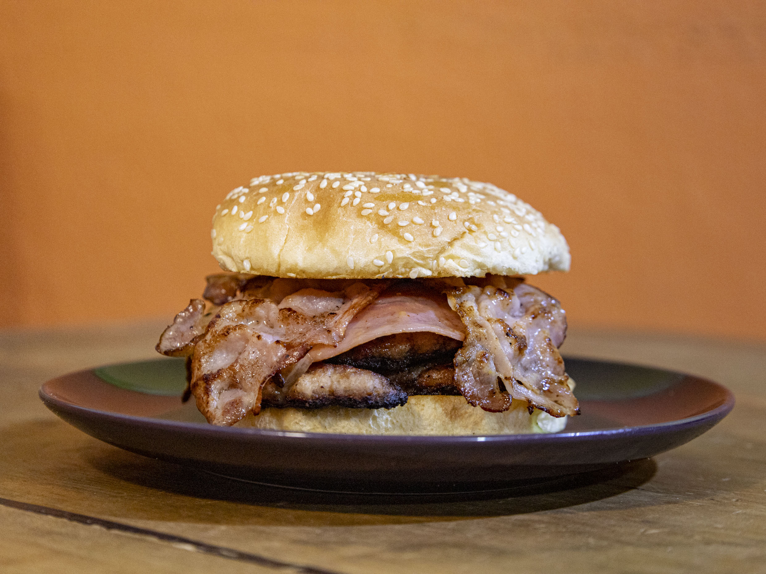 Doble carne artesanal, jamón, tocino, queso amarillo , verdura y aderezos.